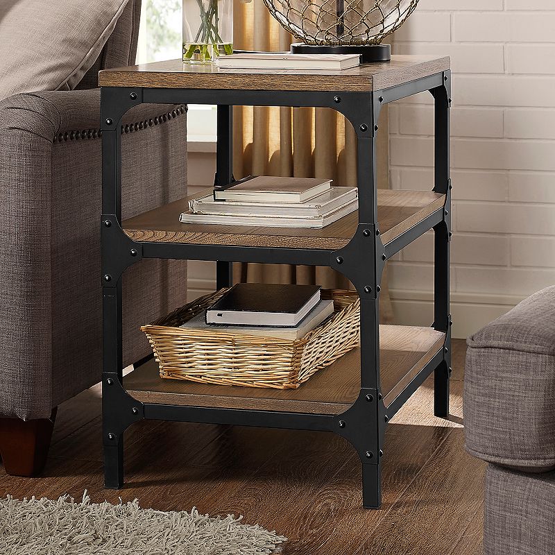 Solid wood shelves on top of a matte metal frame bring out this end table's true fascinating character